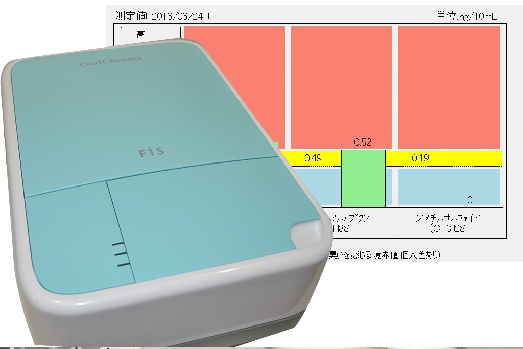 新宮おがわ歯科 おとな・こども歯科では、最新の口臭測定器(オーラルクローマ)を用いた口臭のチェックが可能です。口臭の原因となるガスを分析し、一人一人にあった歯周病治療、セルフケアについて提示させていただきそれに基づいた診療を行います。術前後を比較することで目に見える形で成果を確認することが可能となりました。仮性口臭症(口臭がないのに気になる)の診断にも役立ちます。