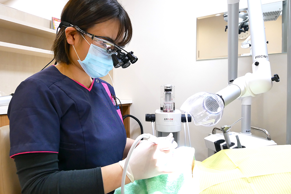 GBTに特化したスイス製の「エアフロー プロフィラキシスマスター」という機器を使い、バイオフィルム・ステイン・歯石などを除去して歯周病治療とメンテナンスを行います。